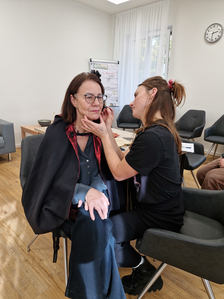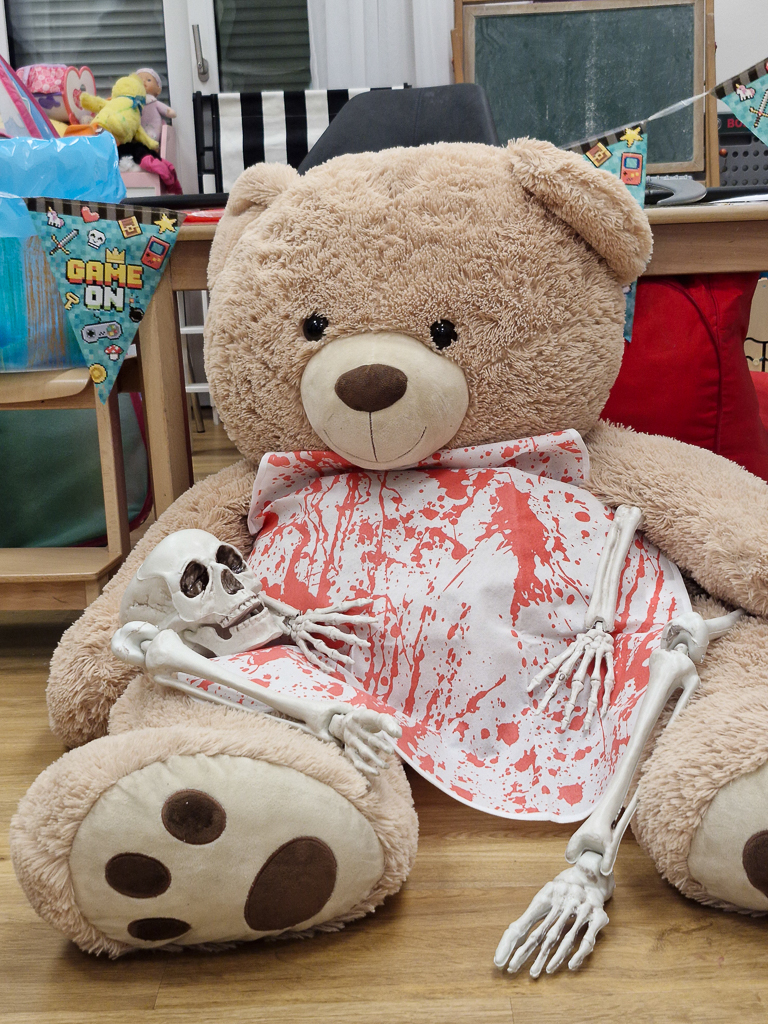Ein besudelter Teddy in Maxi-Größe. 10 Paar schwimmende Augäpfel in einer Plastikwanne. Und: an die 20 halbwüchsige Hexen und Nachwuchsskelette, die wild umherlaufen und markerschütternd kreischen. Tatort des Geschehens: Das Kinderspielzimmer im Wohnheim für Wohnungslose in Marzahn. Muss die Polizei geholt werden? Nein, nur mehr Nachschub an Gruselbrause und Gummifledermäusen für die Halloween-Party der Einrichtung! Bereits am Vormittag hat sich ein kleines Team von Freiwilligen von act3 hier eingefunden, um aus dem bunten, freundlichen Spielzimmer eine finstere Grotte zum Schaudern, Plaudern und Tanzen zu machen. Also heißt es: Fensterläden runter, Einhörner in den Schrank – jetzt sind Spinnen, Zombies und Gespenster am Start! Mit viel Spaß und Liebe zum Detail hängt das Team die schaurigen Girlanden und die Spinnennetze auf und beleuchtet das nun dunkle Zimmer mit Rotlicht und blinkenden Sternchen (oder sind es böse Glühwürmchen?).