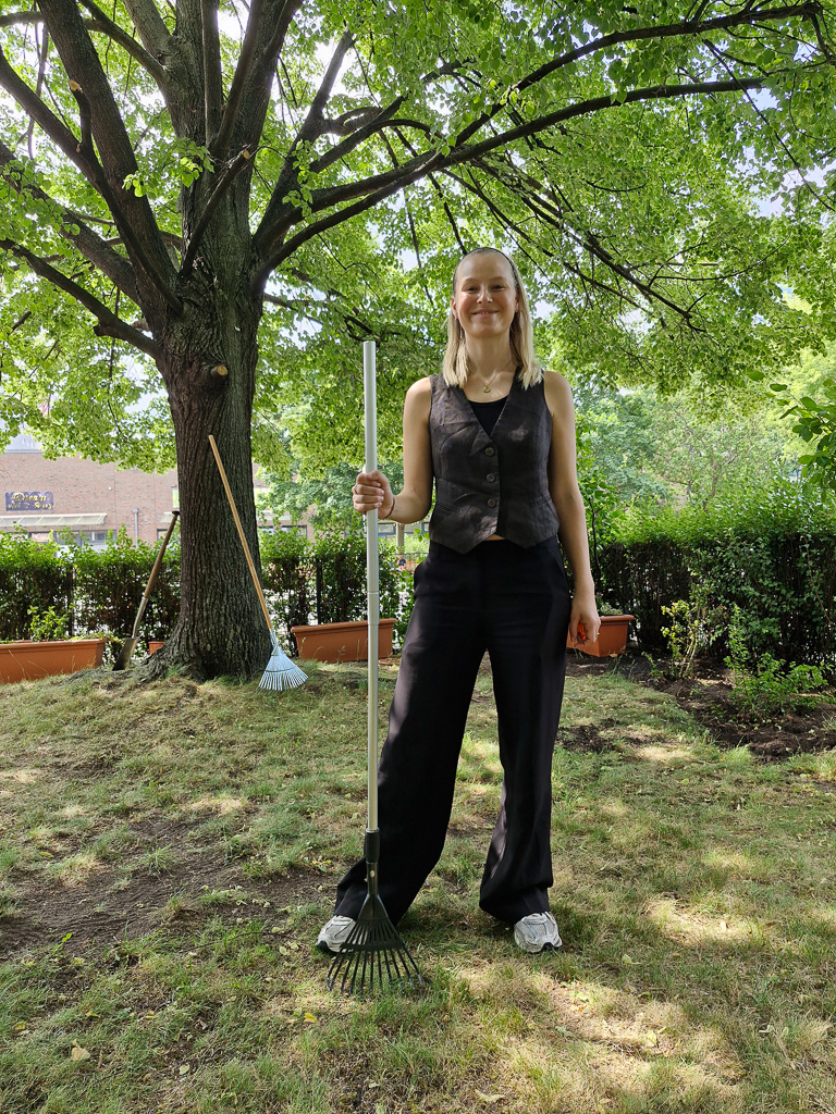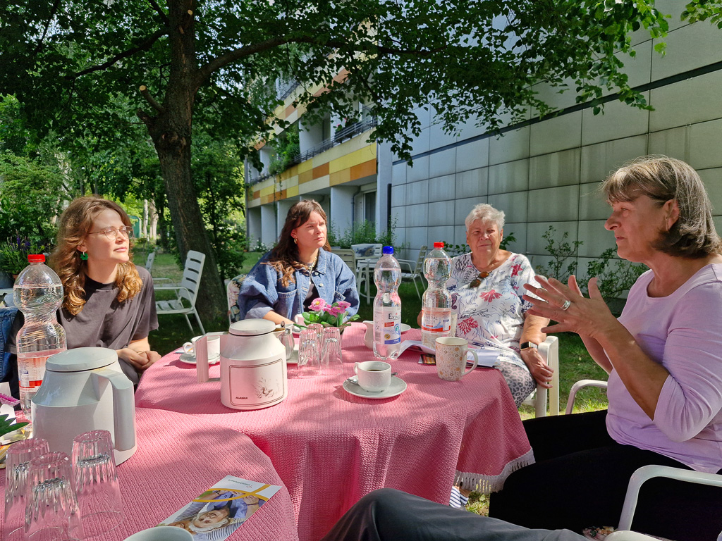 Auch für die Engagierten beginnt der Einsatz mit Kaffee in feinem Porzellan und einer Vorstellung des Seniorenzentrums durch die Leitung Anne Fritzsche. Einige der Freiwilligen brachten bereits Erfahrungen in ehrenamtlichem Engagement mit oder hatten zuvor mit alten Menschen gearbeitet. Beste Voraussetzungen für einen motivierten Start! Motto: Platz für Neues! Die Gartenstühle und -tische wurden zur Seite geräumt, um den Rasen von jeder Menge Laub zu befreien, welches das frische Grün bedeckte. Zeitgleich wurden verwitterte Pflanzen und Unkraut aus den Beeten und Blumentöpfen entfernt und die Terrasse freigelegt – alles unter den neugierigen Blicken der Besucher*innen des Zentrums, die gerade im direkt angrenzenden Veranstaltungsraum am Angebot „Seniorensport“ teilnahmen.