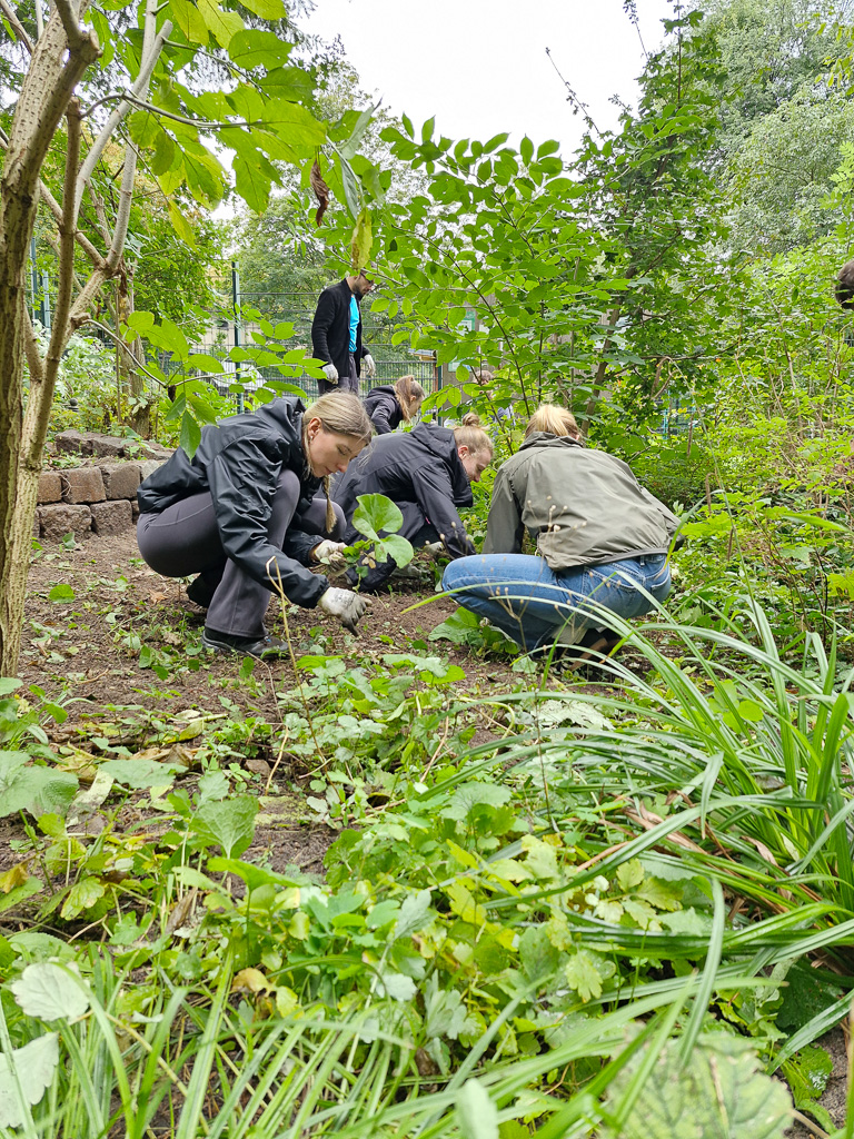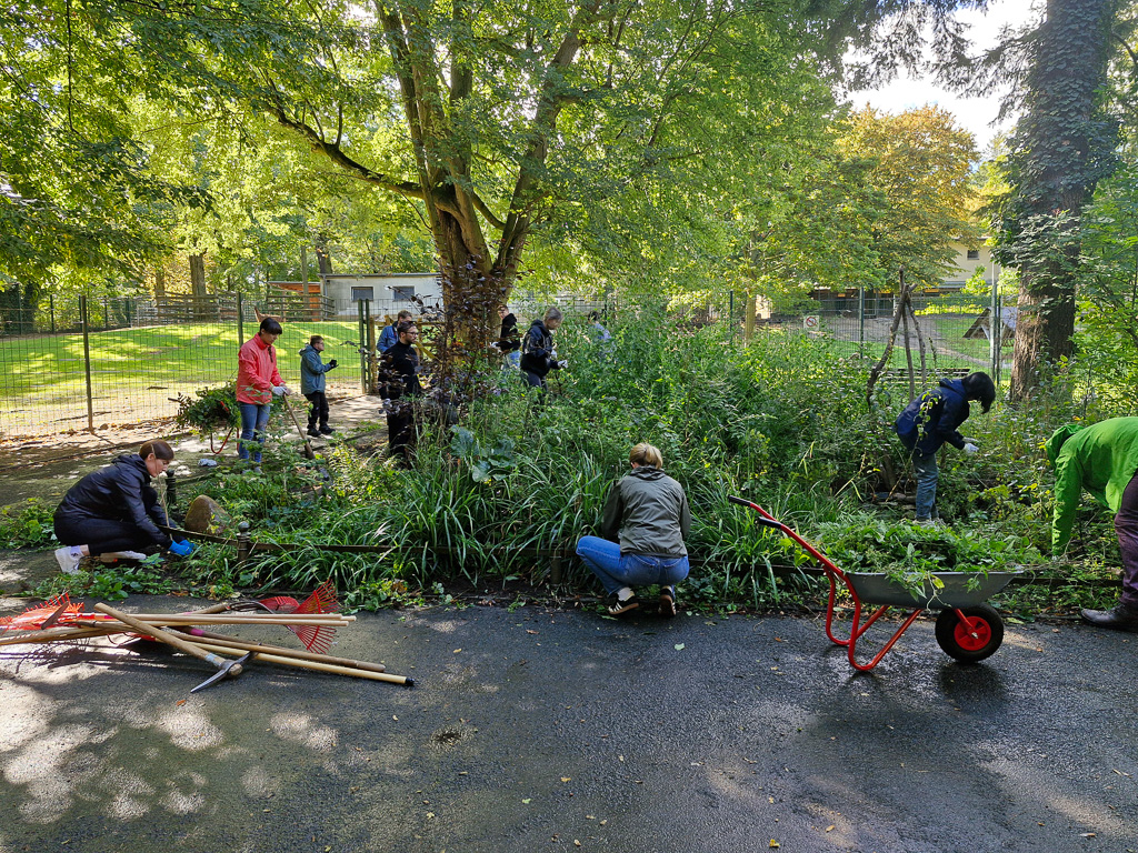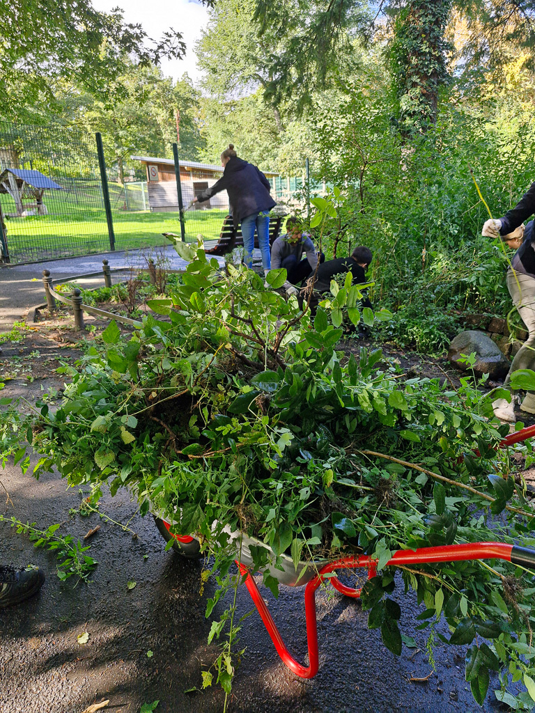 Ein besonders einsatzfreudiges Team durften wir Mitte September 2025 begrüßen: Nachdem es sich tags zuvor bereits beim Demokratietag engagiert hatte, packte das 12-köpfige Team von Pfizer auch bei uns im Tierpark Neukölln an. Ein Einsatz nur für Wetterfeste, aber vom angekündigten Unwetter ließen sich die fleißigen Helfer*innen nicht abhalten, denn auf dem weitläufigen Gelände der Einrichtung für Menschen mit psychischen Beeinträchtigungen gibt es immer viel zu tun! Diesmal war ein großes Beet dran, das als solches gar nicht mehr zu erkennen war. Es wurde fleißig Unkraut gejätet, wucherndes Gestrüpp entfernt und übergriffige Pflanzen entwurzelt, bis wieder die einst angelegten Steinsäume des Beets zu sehen und Platz für neues Grün geschaffen war. Robert Seuntjens, Leiter des Tierparks, plant hier frische, heimische, nützlingsfreundliche Pflanzen, die Insekten und andere Tiere, die auf dem Gelände nisten, anziehen sollen.