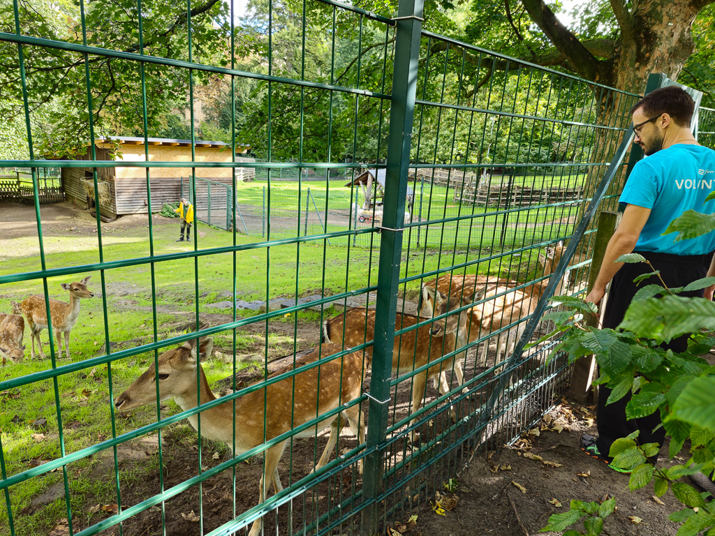 Bereits zum zweiten Mal fand Pfizer sich im Tierpark ein, nachdem sie im vorangegangenen Jahr den Zaun des Eselgeheges erneuert, geschliffen und gestrichen hatten. Die Esel durften sie – neben den Pfauen, Kaschmirziegen, Gänsen und Lamas – auch an diesem Tag bewundern, denn eine Tierführung war natürlich inklusive. Die Union Sozialer Einrichtungen (USE), zu der auch der Tierpark gehört, lieferte zwischendurch vegane Verpflegung zum Mittagessen und nur das aufziehende Gewitter störte kurz den Abschluss der Aktion. Doch nachdem der Himmel sich geleert hatte, kehrte die Gruppe zum Einsatzort am Ziegengehege zurück, um die Arbeiten dort zu beenden. Das letzte Gestrüpp und Unkraut wurde entfernt und schubkarrenweise zur Grünschnittsammlung auf den Hof gebracht. Ergebnis: Ein runder Abschluss und ein hocherfreuter, dankbarer Tierparkleiter! Danke, liebes Pfizer-Team, für die Verschönerung der Hasenheide und die Treue zu unserer wunderbaren Einrichtung!