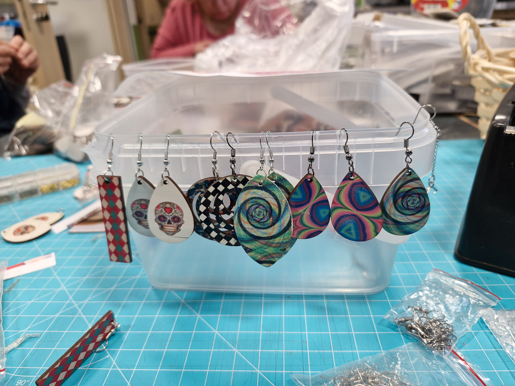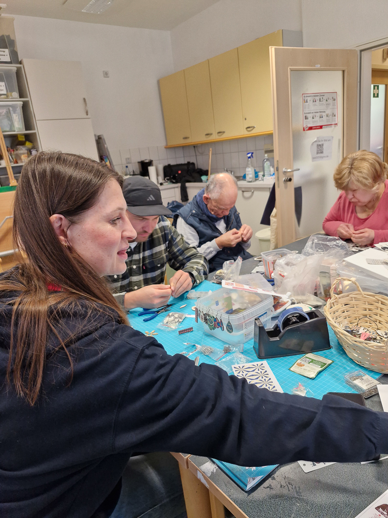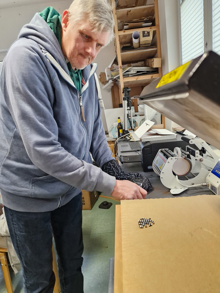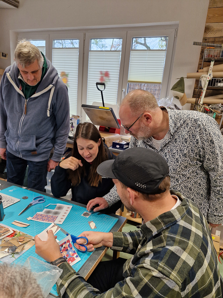 An diesem Tag jedoch wird es ganz analog: In der kleinen einrichtungseigenen Werkstatt lernen die Freiwilligen, wie sie mit der Technik der Heißfolienprägung dekorative Produkte wie Anhänger für Ohrringe und Weihnachtsbaumschmuck herstellen können. Gelernt – getan! Nach und nach entstehen unter Anleitung von Betreuer Andreas Stoltz und dem fachkundigen Bewohner Michael immer mehr schöne Dinge, die staunen lassen, wie viel man aus so wenig machen kann. Ganz nebenbei werden auch noch zahlreiche Tassen bedruckt und Lesezeichen verpackt.